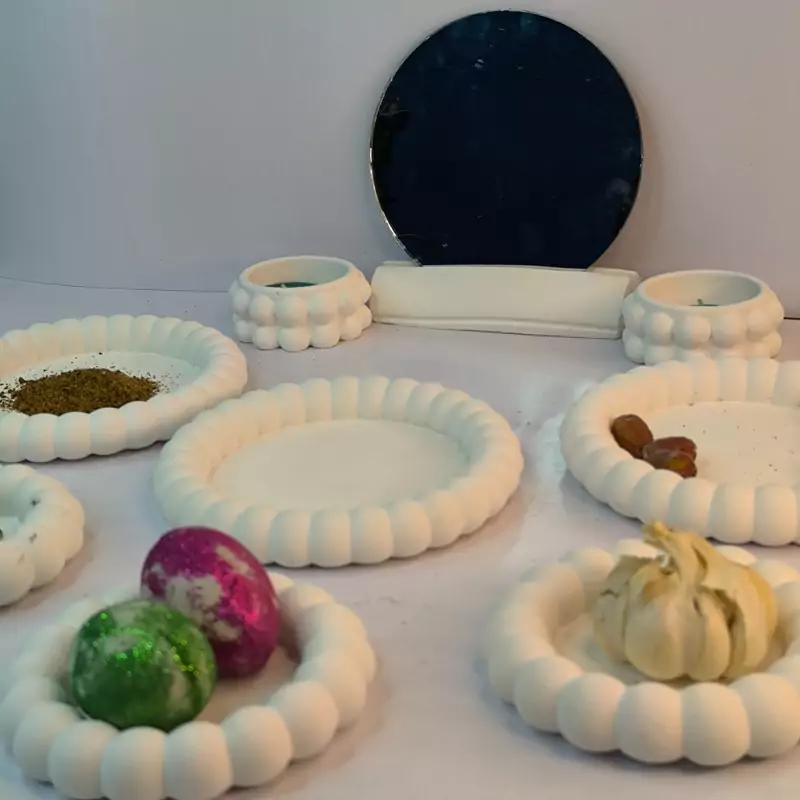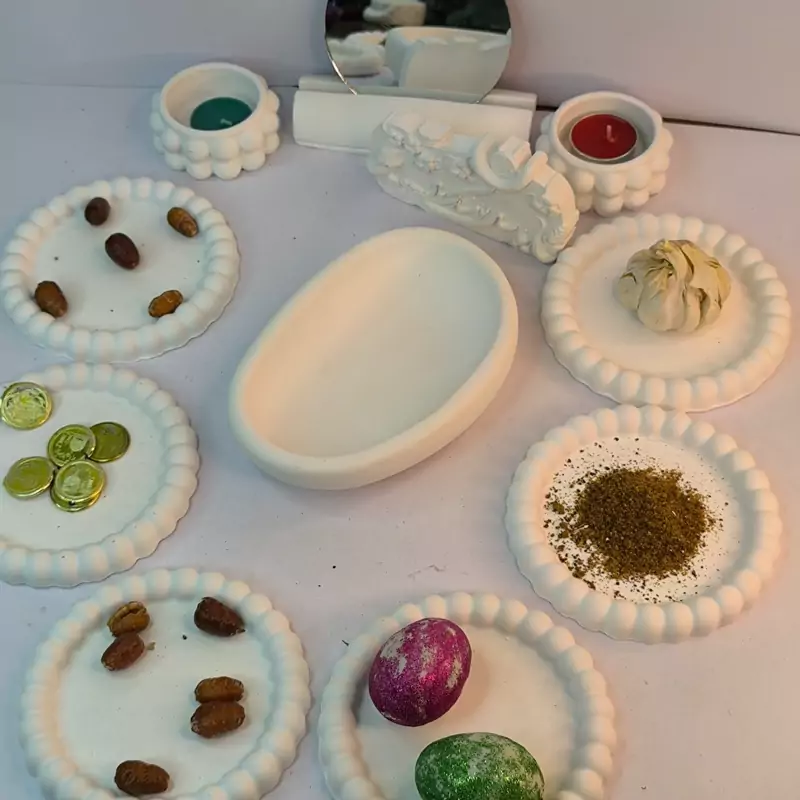 ست هفت سین نوروزی طرح یشقاب مرواریدی مدرن و شک همراه جاسبزه و نماد مار و تندیس نوروز مبارک با رنگهای جذاب که از جنس سنگ مصنوعی در کارگاه تولیدی دکوراتیو لیانا با تضمین کیفیت تولید شده است.